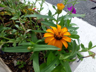 それでもジニアがあちこちに一人生えしてました。この鉢のペチュニアもメランポジウムも