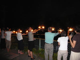 点火した。私たちは庫裏の前のフェンスに並んだ。下から見たらあちこちで花火の列が