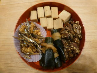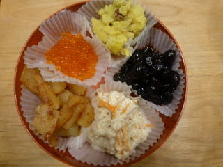 どうもオードブルは残るので、今年はその逆で、各自の弁当+刺身はテーブルに1皿としました。