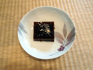 山桃のシロップ煮をアクセントにしました。もう一つは黒砂糖を葛粉で固めたもの。きな粉をか